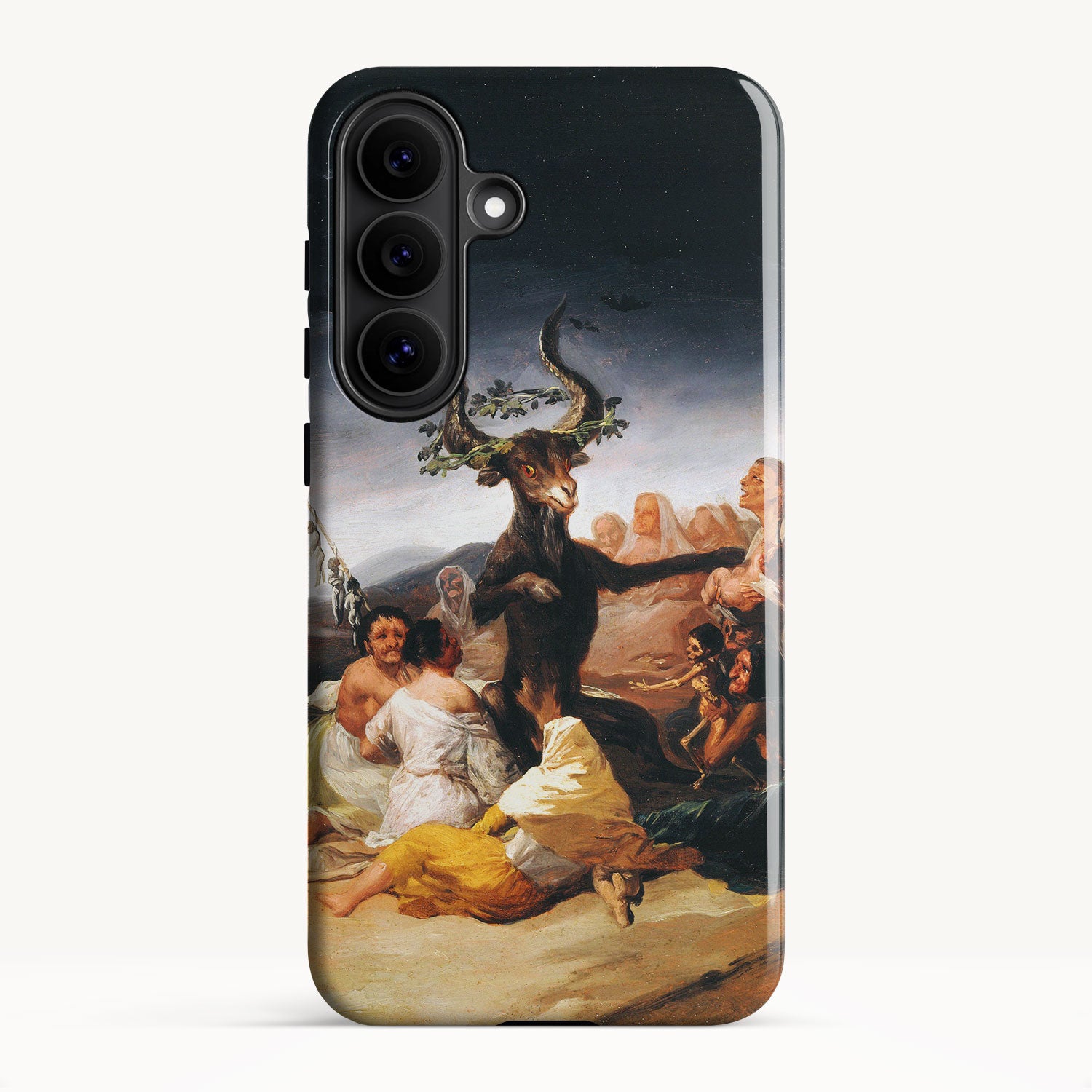 In the painting, Goya depicts a moonlit gathering of witches in a desolate landscape, engaged in an occult ritual and feeding infant souls to a goat-like figure with large horns.