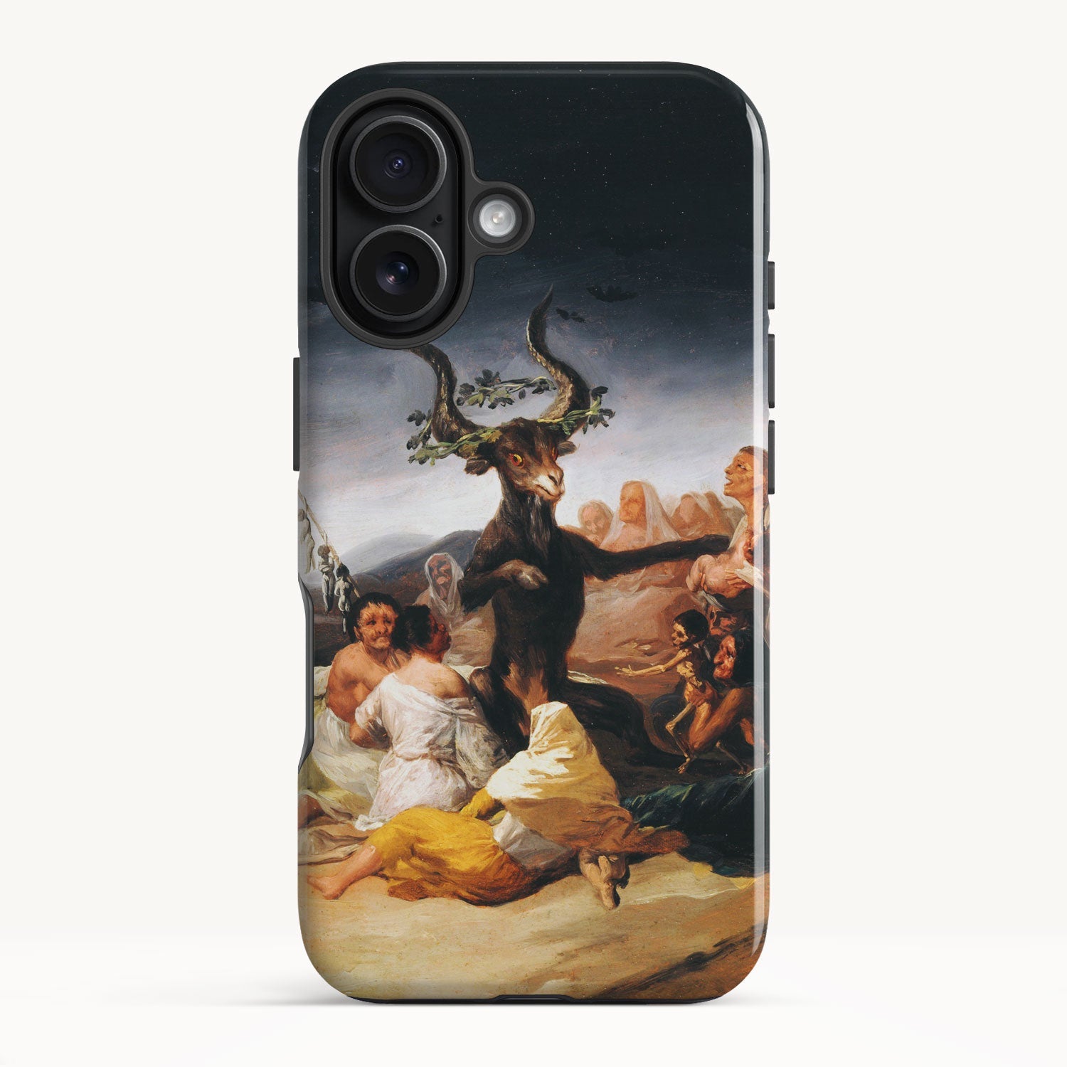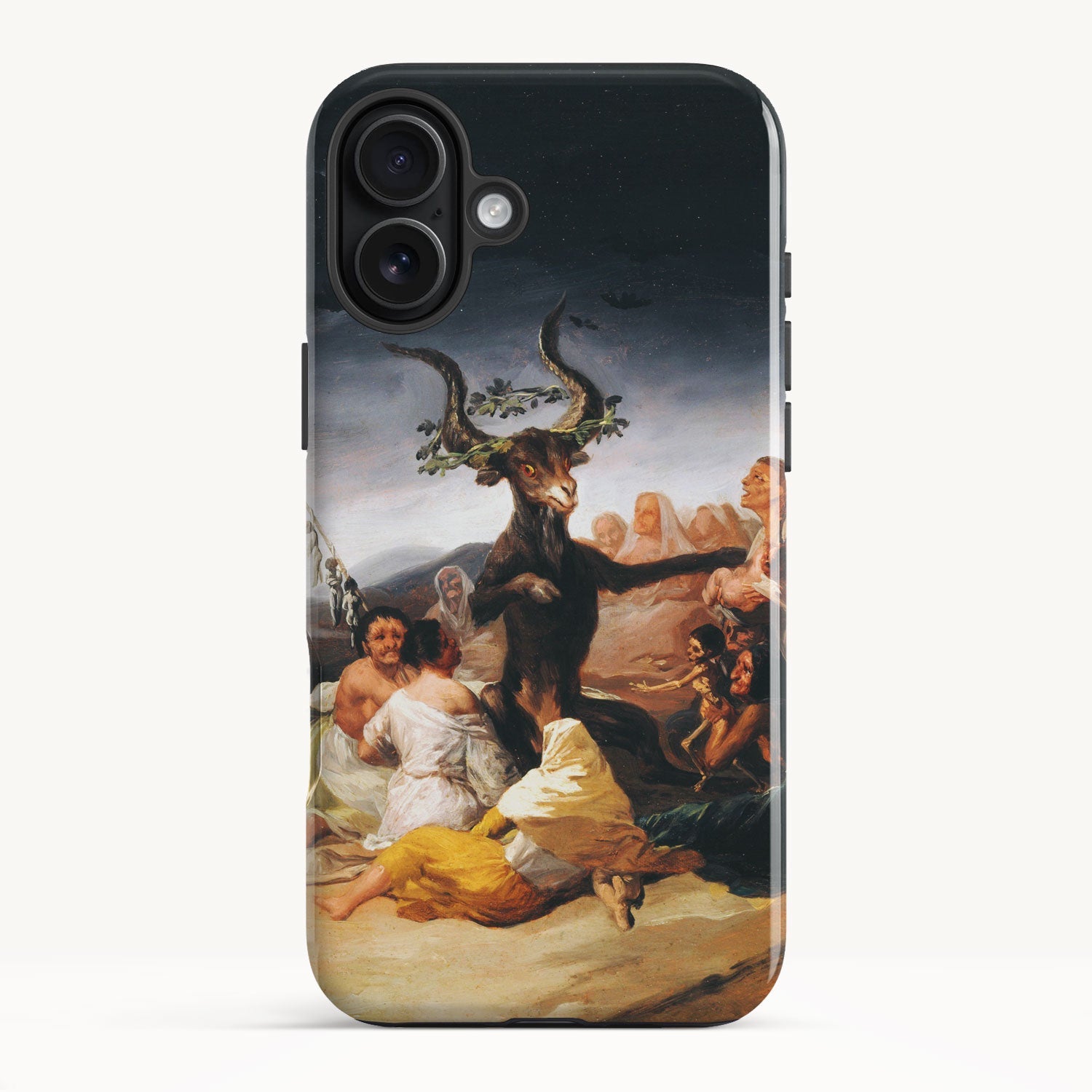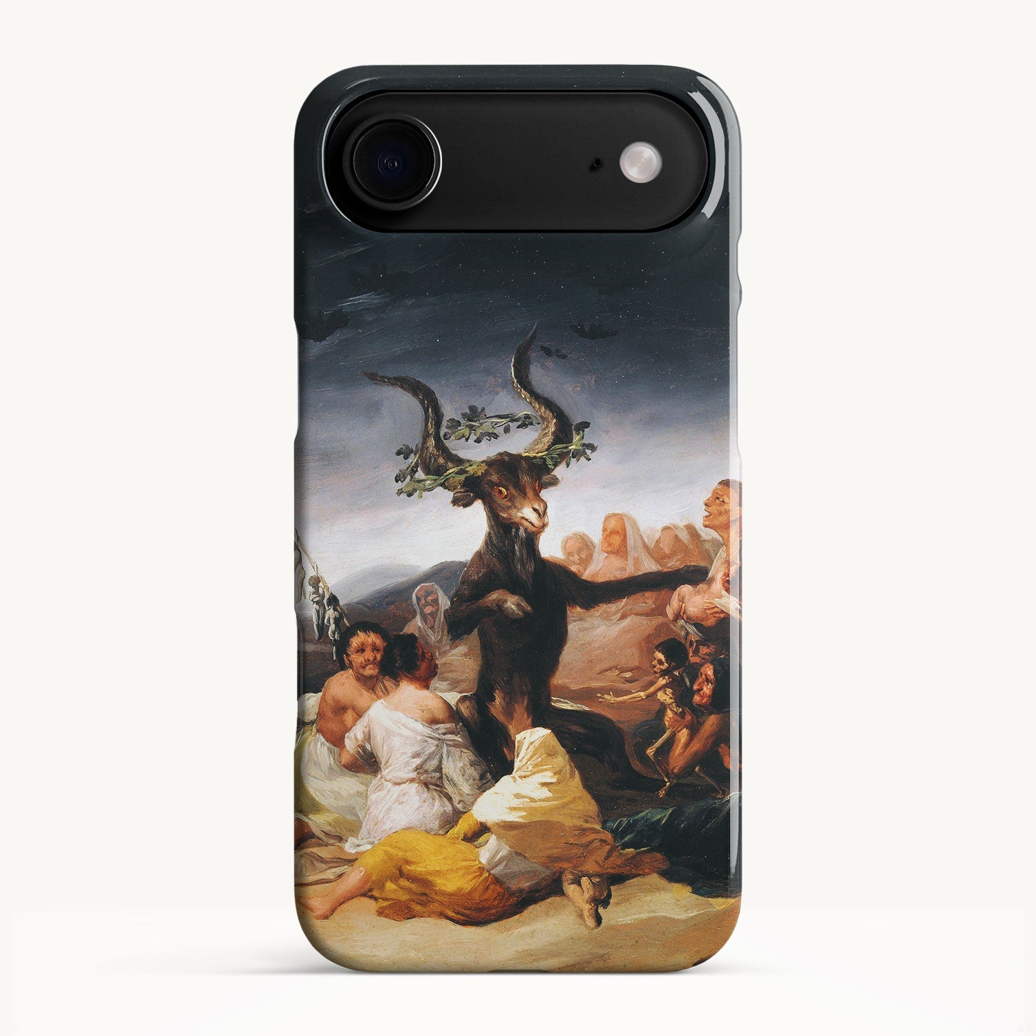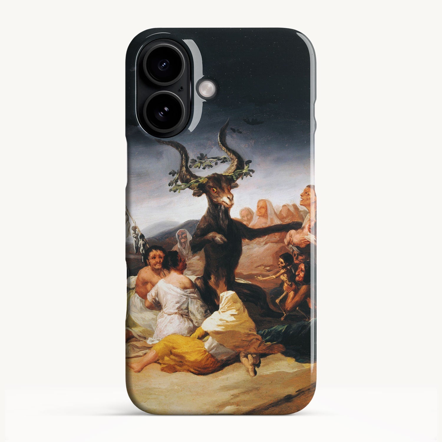 In the painting, Goya depicts a moonlit gathering of witches in a desolate landscape, engaged in an occult ritual and feeding infant souls to a goat-like figure with large horns.