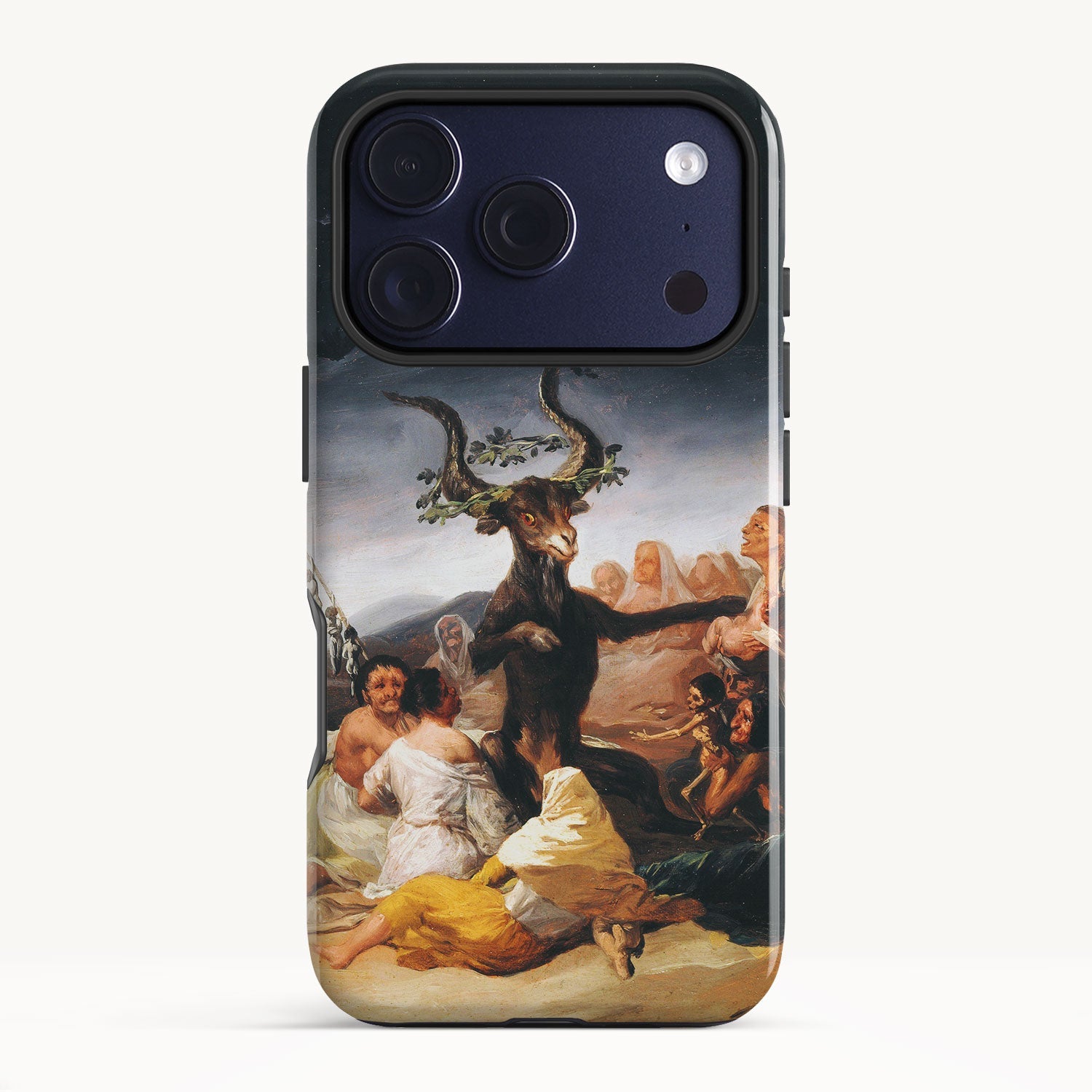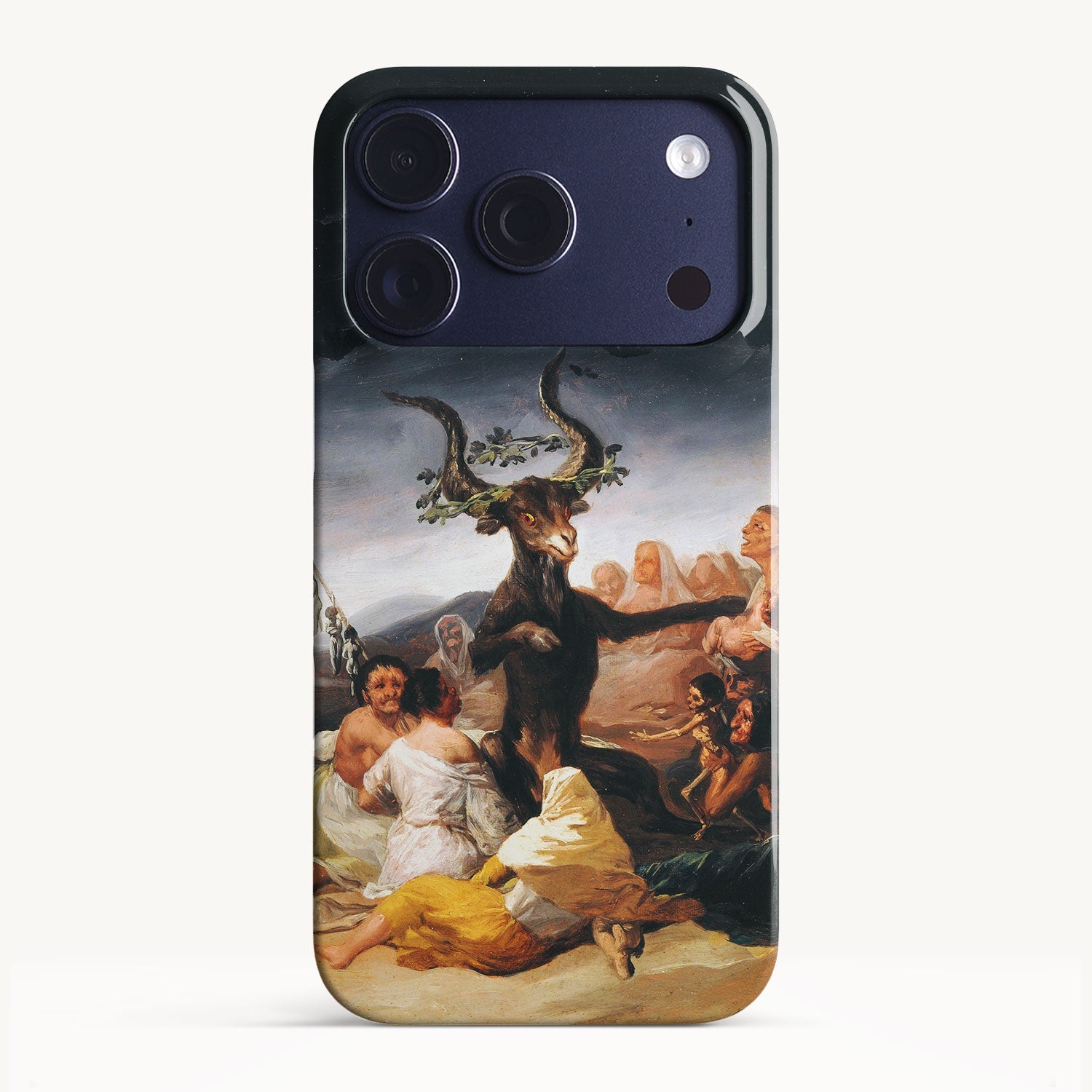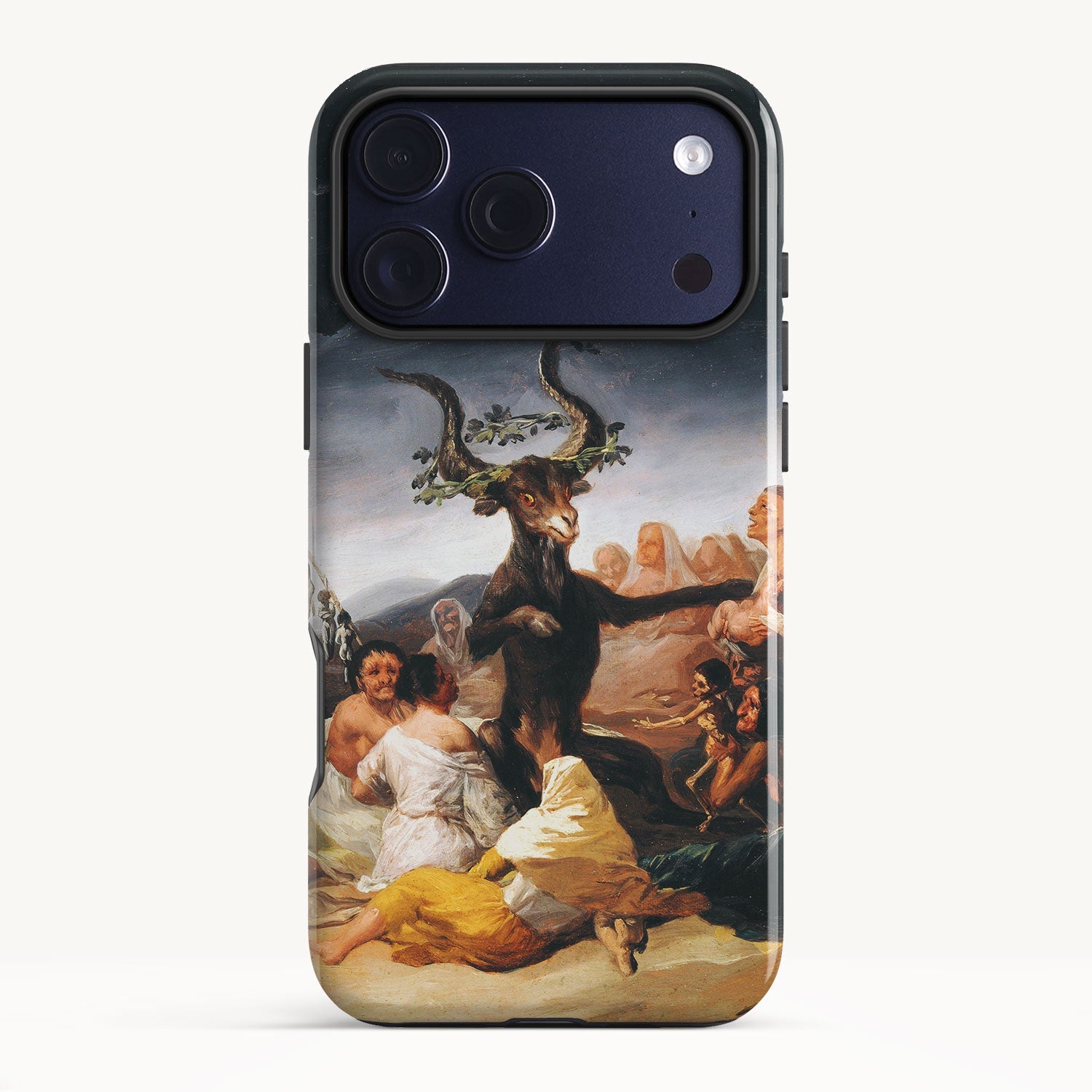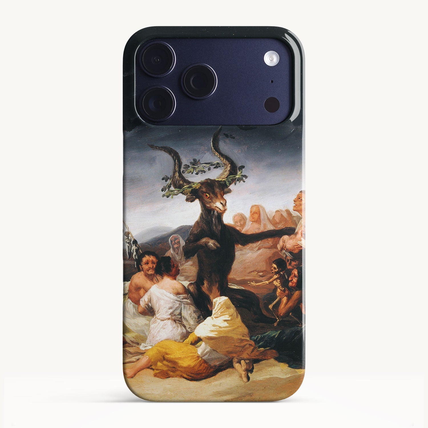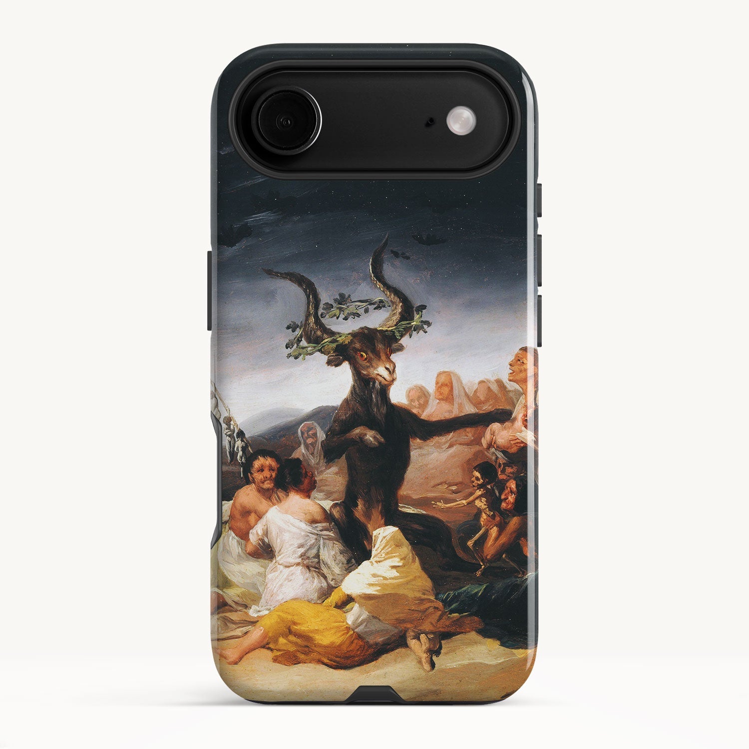 In the painting, Goya depicts a moonlit gathering of witches in a desolate landscape, engaged in an occult ritual and feeding infant souls to a goat-like figure with large horns.